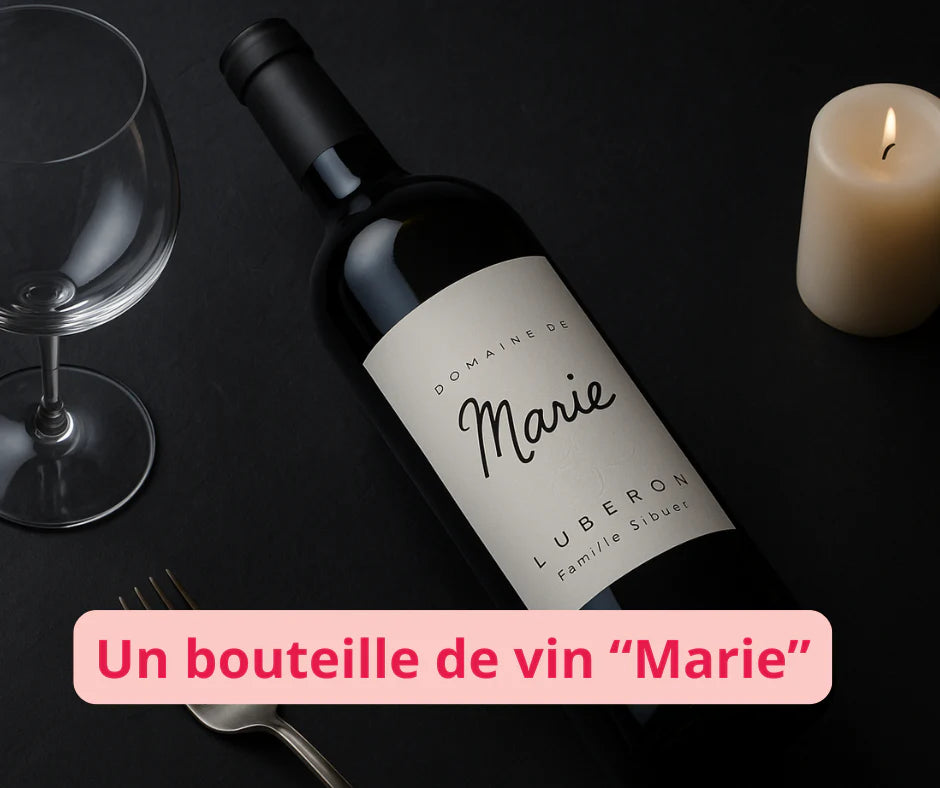 - La bouteille de vin rouge “Marie” AOP Luberon : à l’image de la Vierge Marie, ce vin est tout en grâce et en finesse. Sa robe pourpre et ses arômes de fruits rouges, fleurs et café en font un accord parfait avec la charcuterie.