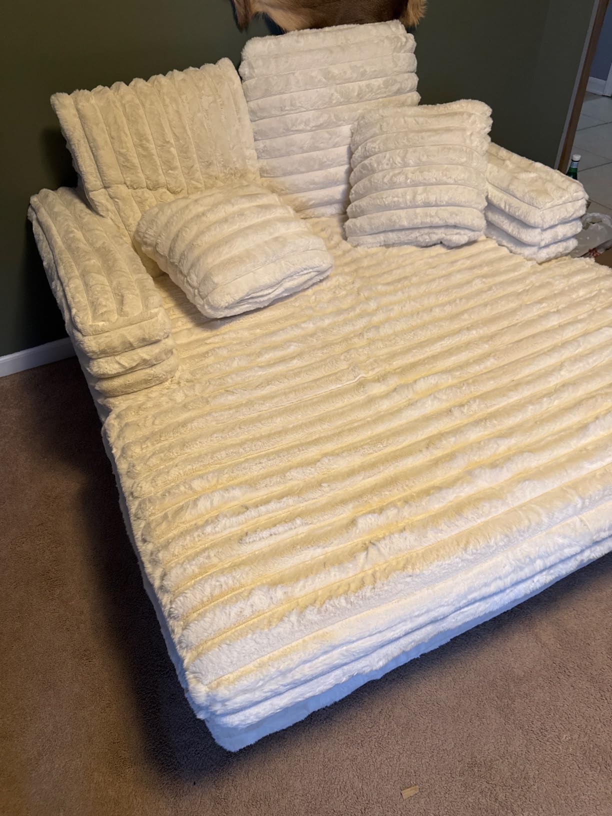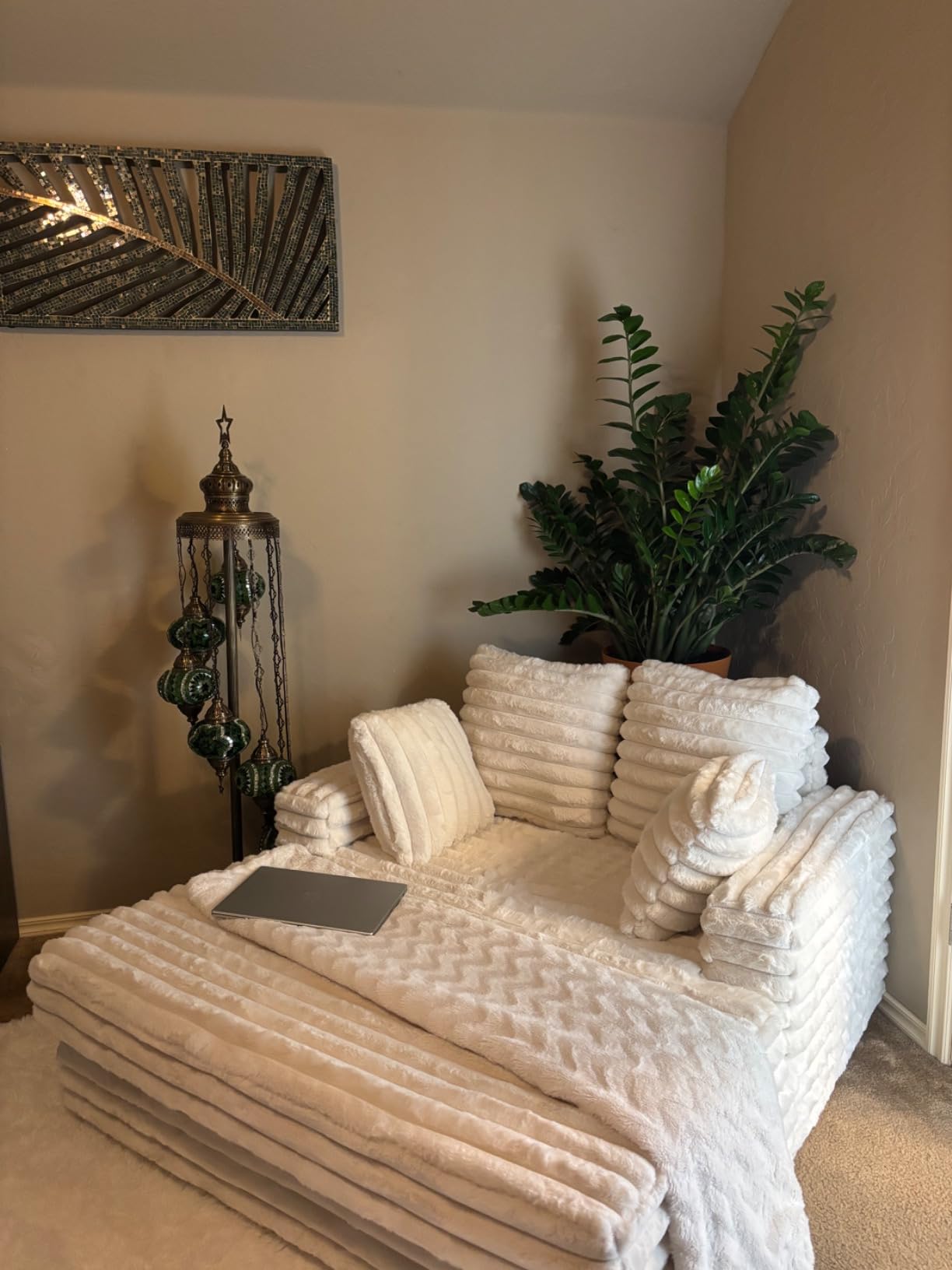 Revêtue d’un tissu en fausse fourrure à rayures ultra-doux et dotée d’un coussin épais de 15 cm, elle procure une sensation moelleuse et enveloppante, comme sur un nuage, pour évacuer tout le stress.