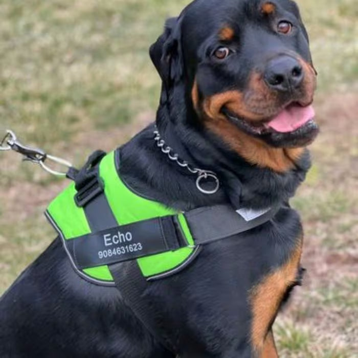 Chaque harnais EasyHarness® est fabriqué avec le nom et le numéro de téléphone de votre chien. Vous pouvez choisir d'écrire ce que vous voulez, que ce soit le nom de votre chien, « Ne pas caresser » ou « En formation ».