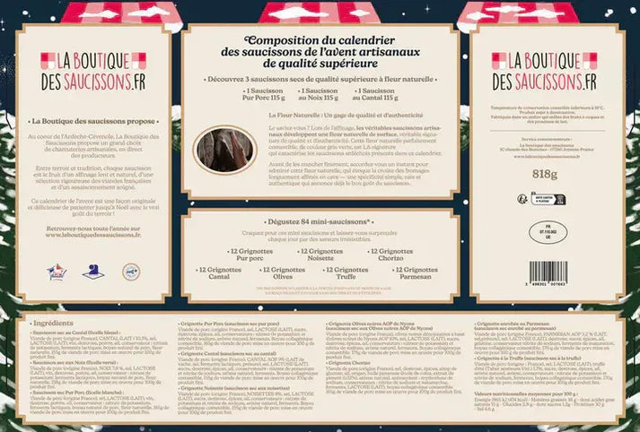 Quelle excellente idée ! Chaque jour, on ouvre une case avec les enfants (qui, bien sûr, goûtent la version nature) et on se régale. Les saucissons sont fins et bien tranchés, parfaits pour l'apéritif. La mention "fabrication artisanale française" n'est pas un vain mot, ça se sent tout de suite au goût. La conservation au frigo est simple et on apprécie que les DDM nous laissent le temps de tout déguster sans stress. Un produit de qualité, convivial et qui fait plaisir. Achat reconduit l'année prochaine sans hésiter !